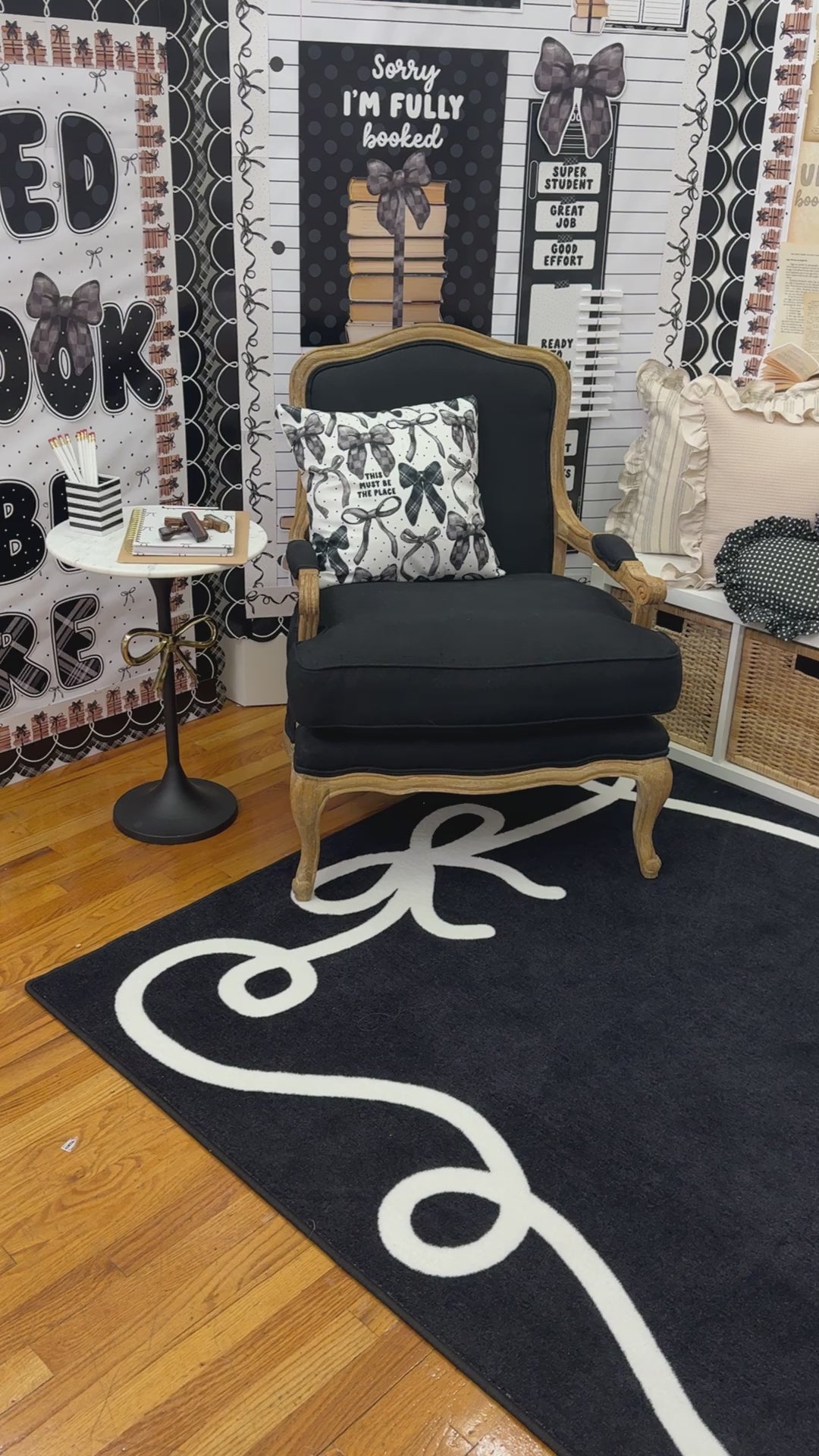 Add beauty and function to your classroom with the Bow Border Black Classroom Rug from Schoolgirl Style. Featuring classic black background with elegant white bow border, this rug is perfect for neutral, modern, or minimalist classroom themes. With soft, durable construction for daily classroom use, its the perfect foundation for learning spaces. Coordinates with Schoolgirl Style collections and ideal for circle time or reading areas